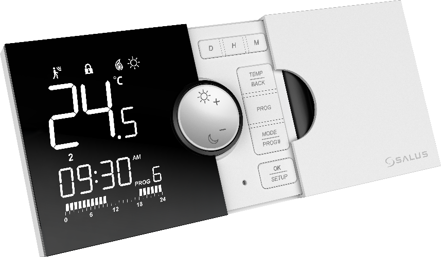 The SALUS 091Pro-RF is a modern thermostat used for controlling heating or cooling systems. Its LCD screen and icons make it easy to use β for both installers and home users. Below is a clear explanation of the most important parts of the display. 1. ...
