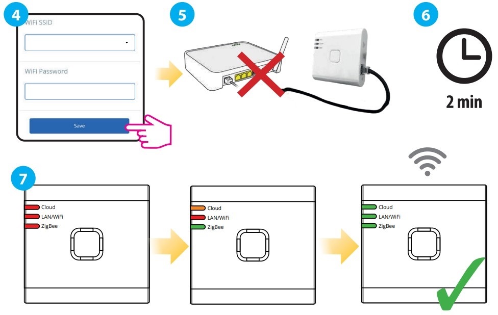 2.5. Unplug the UG800 (5) and move it more central, near a power socket, power up the UG800 via the USB cable and adapter, when all lights turn green it has successfully connected (7):