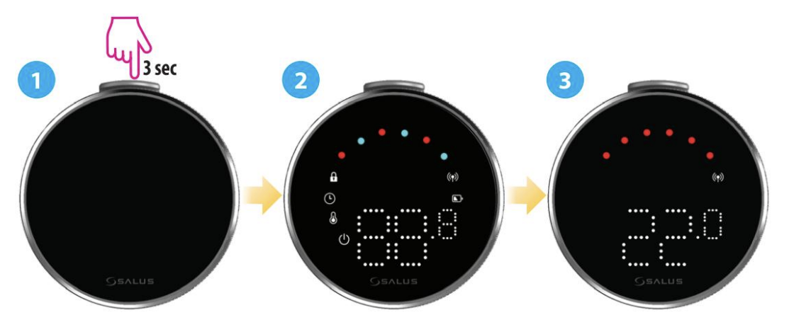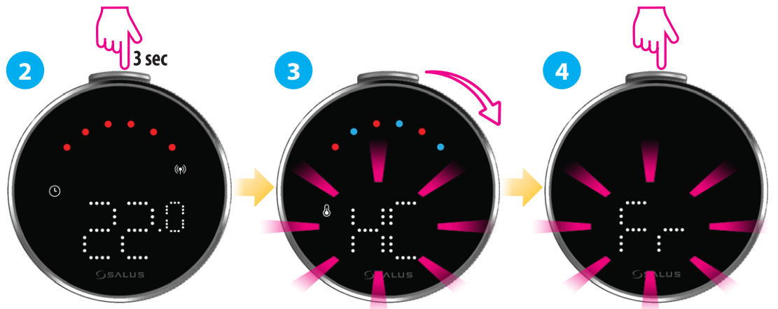 1. Accessing Factory Reset: Press and hold the button on top of the thermostat until the display lights up. Then, turn the dial to show “Fr” (Factory Reset). Confirm with a short press on the button on the top.