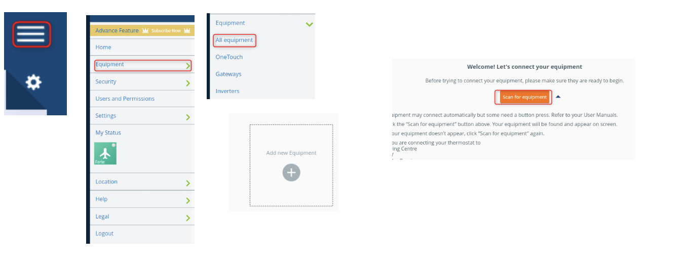 Step 2. Start a “scan for equipment” in the app by pressing the menu button at the top right corner. Choose equipment, all equipment, add new equipment, scan for equipment.